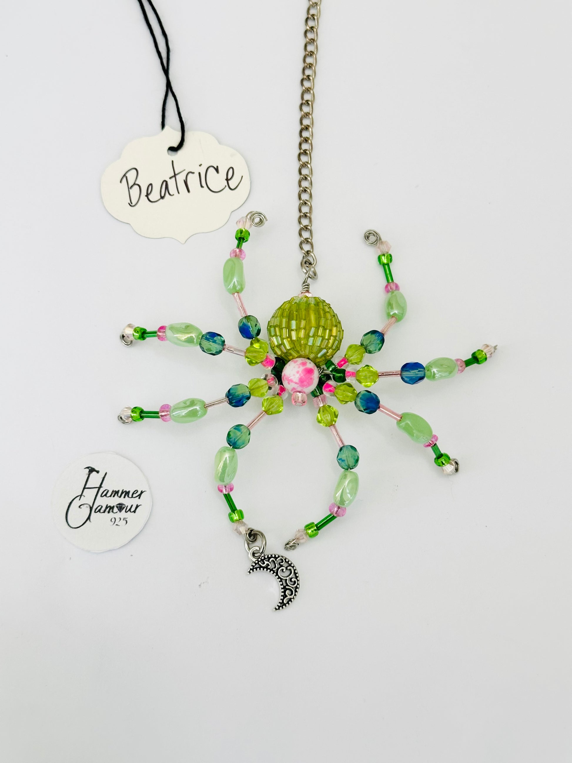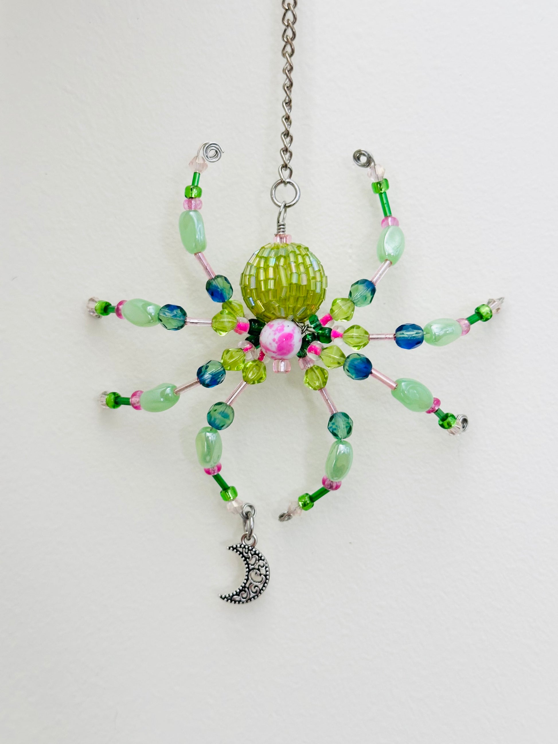 Presenting the One and Only "Beatrice" the Magical Spider. Glass Crystals, Genuine Gemstones, Metal Beads, and very occasionally, Wood, Clay, Ceramic, and Acrylic, make these Original Suncatchers Sparkle and Shine. Spiders are known for their curiosity, creative energy, patience, and wisdom. Display them in your windows, above a desk, or on a wall, throughout the year. Or place them on your Holiday Trees, to honor an old Scandinavian Tale of spiders who weave webs that turn to gold and silver- The Christmas Spider Story.
