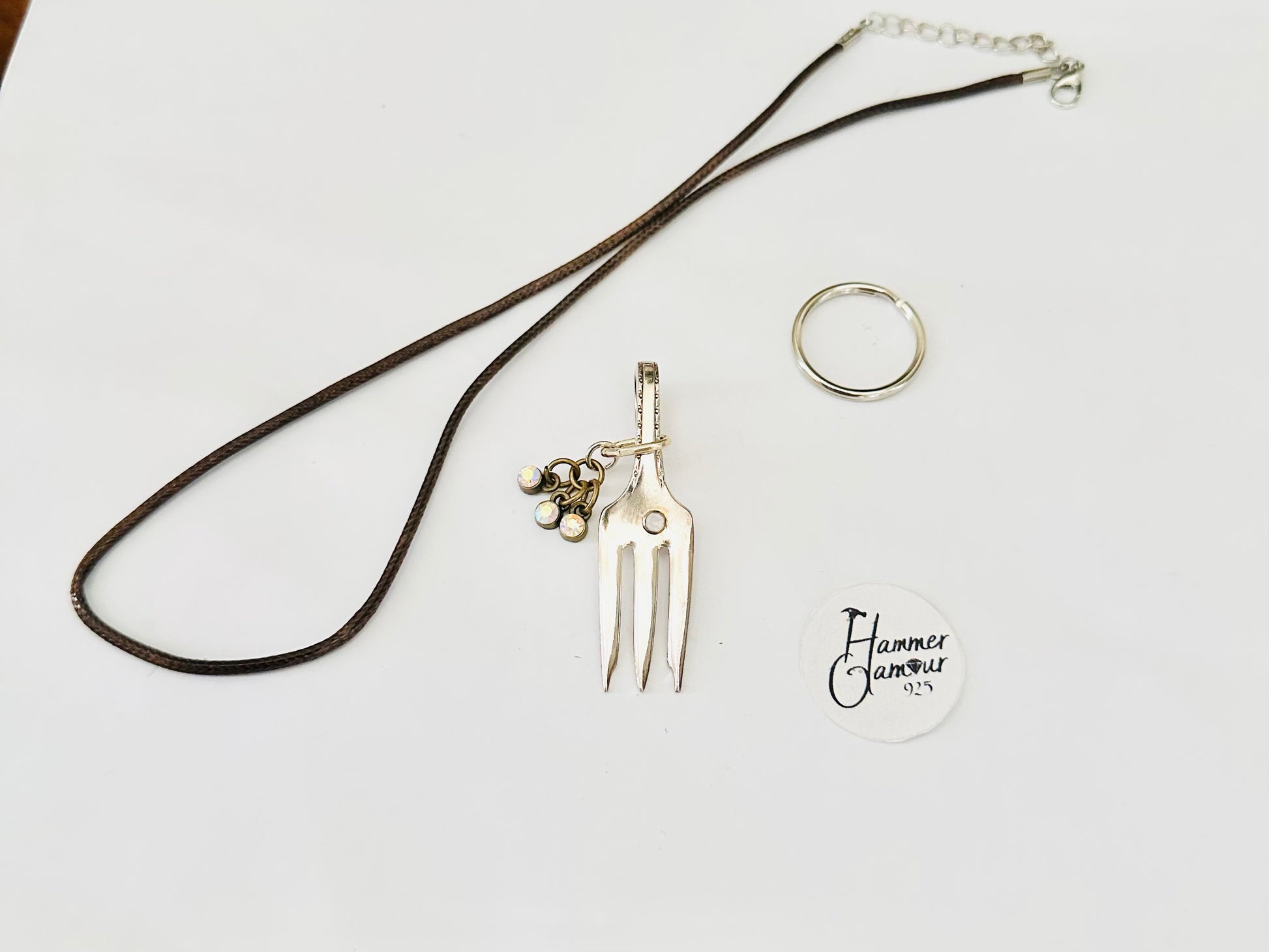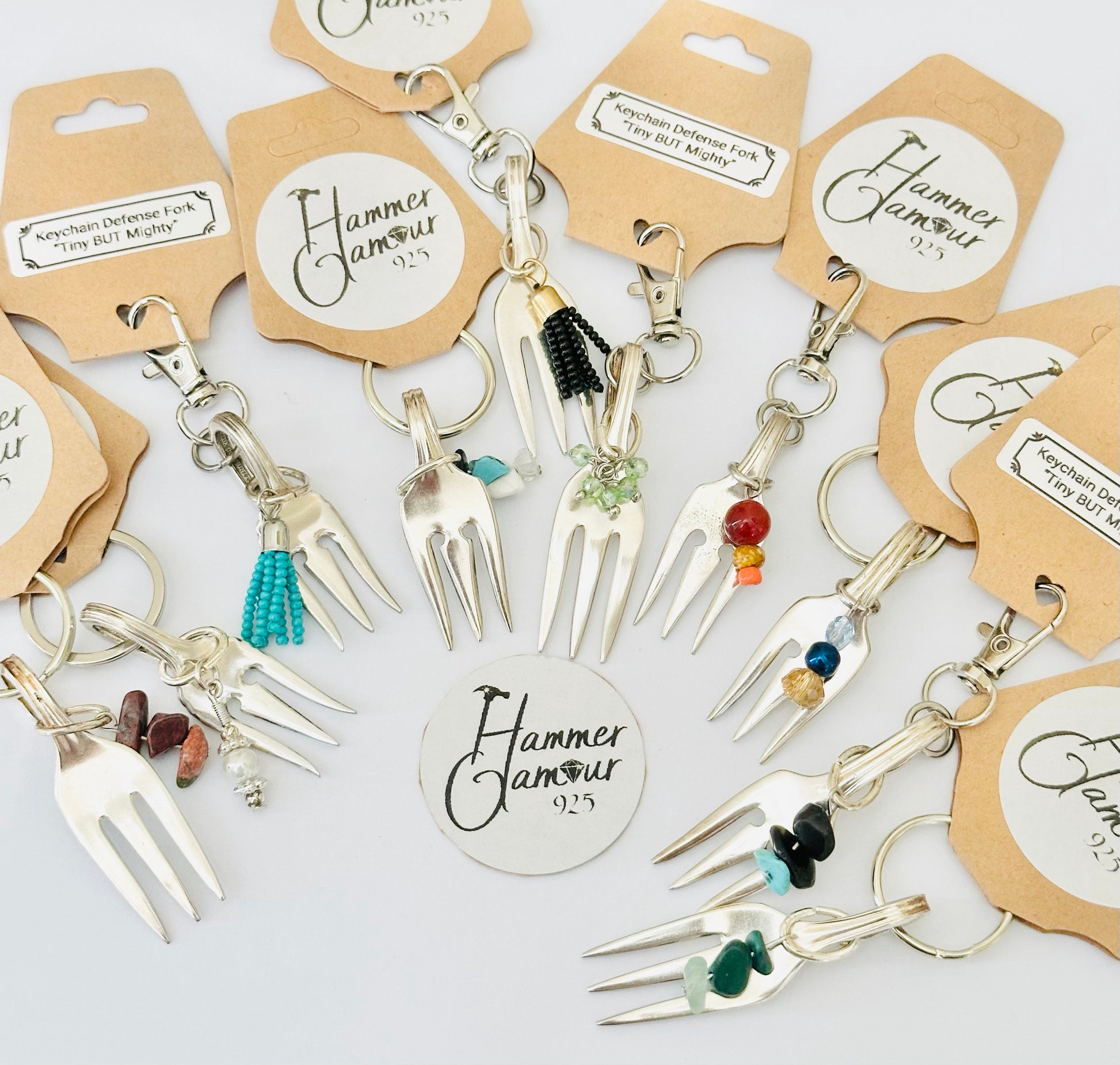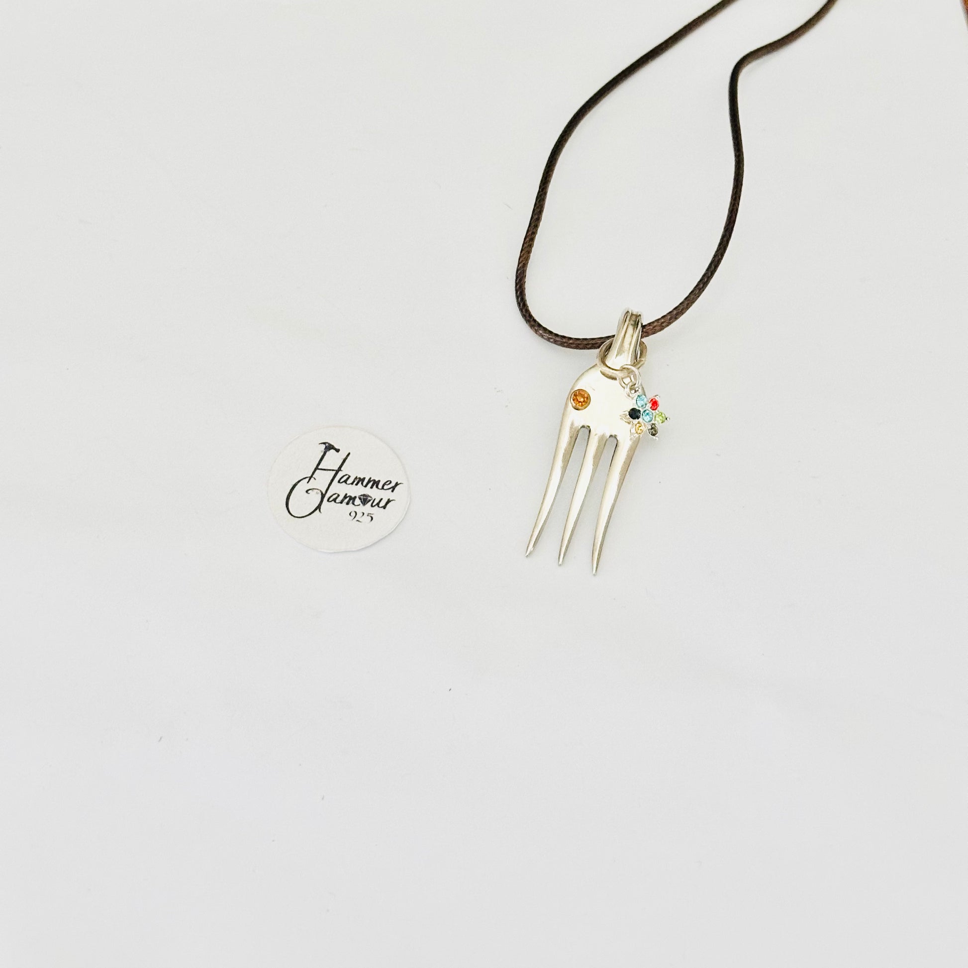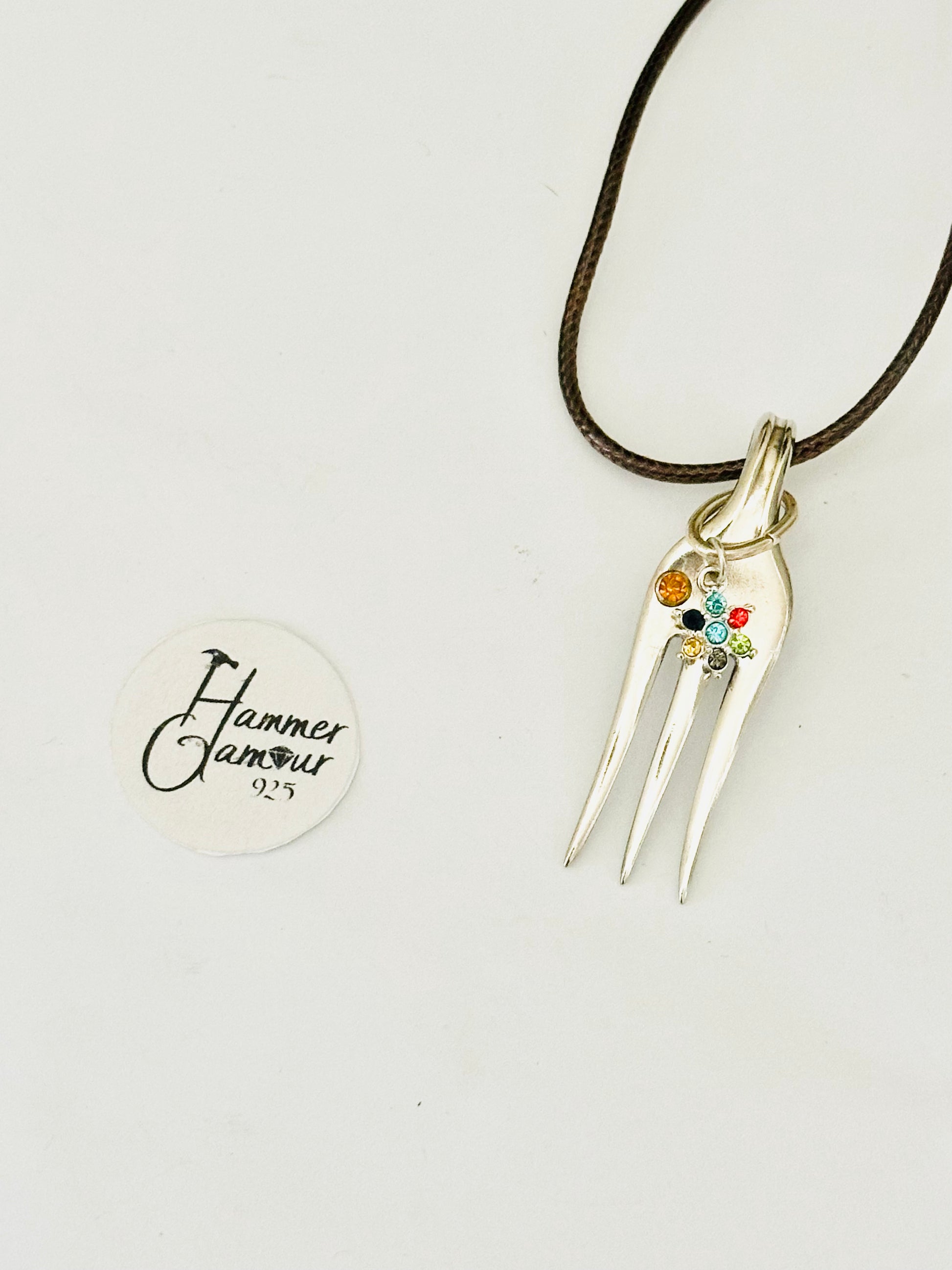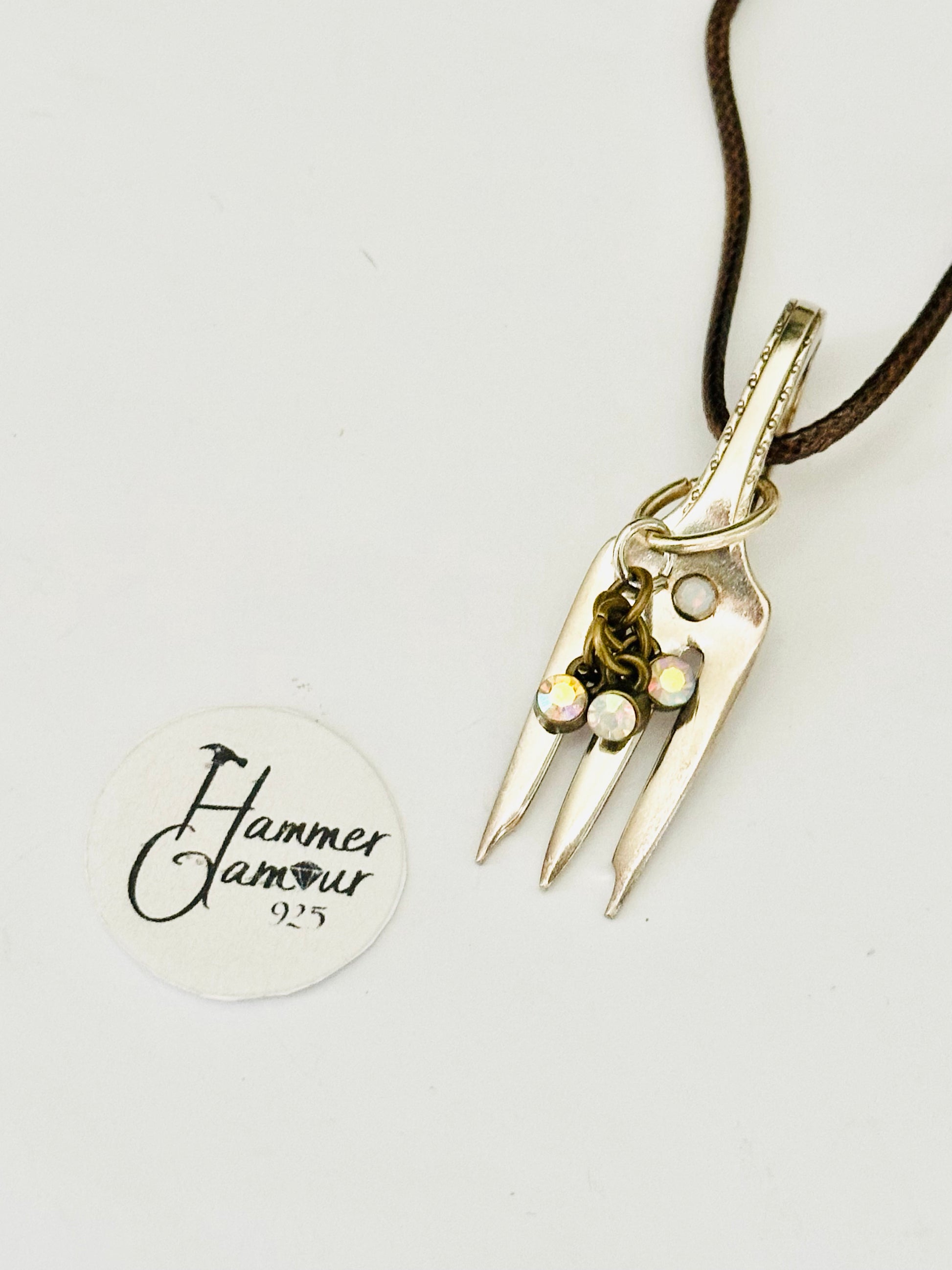 Made from a Vintage Sterling Silver Plated Cocktail Fork, this little poker is just enough to get the job done, plus it’s cute as a necklace or on a keychain. Gemstones, beads, glass crystals, and other embellishments add to their charm & uniqueness.